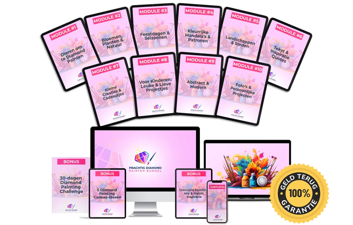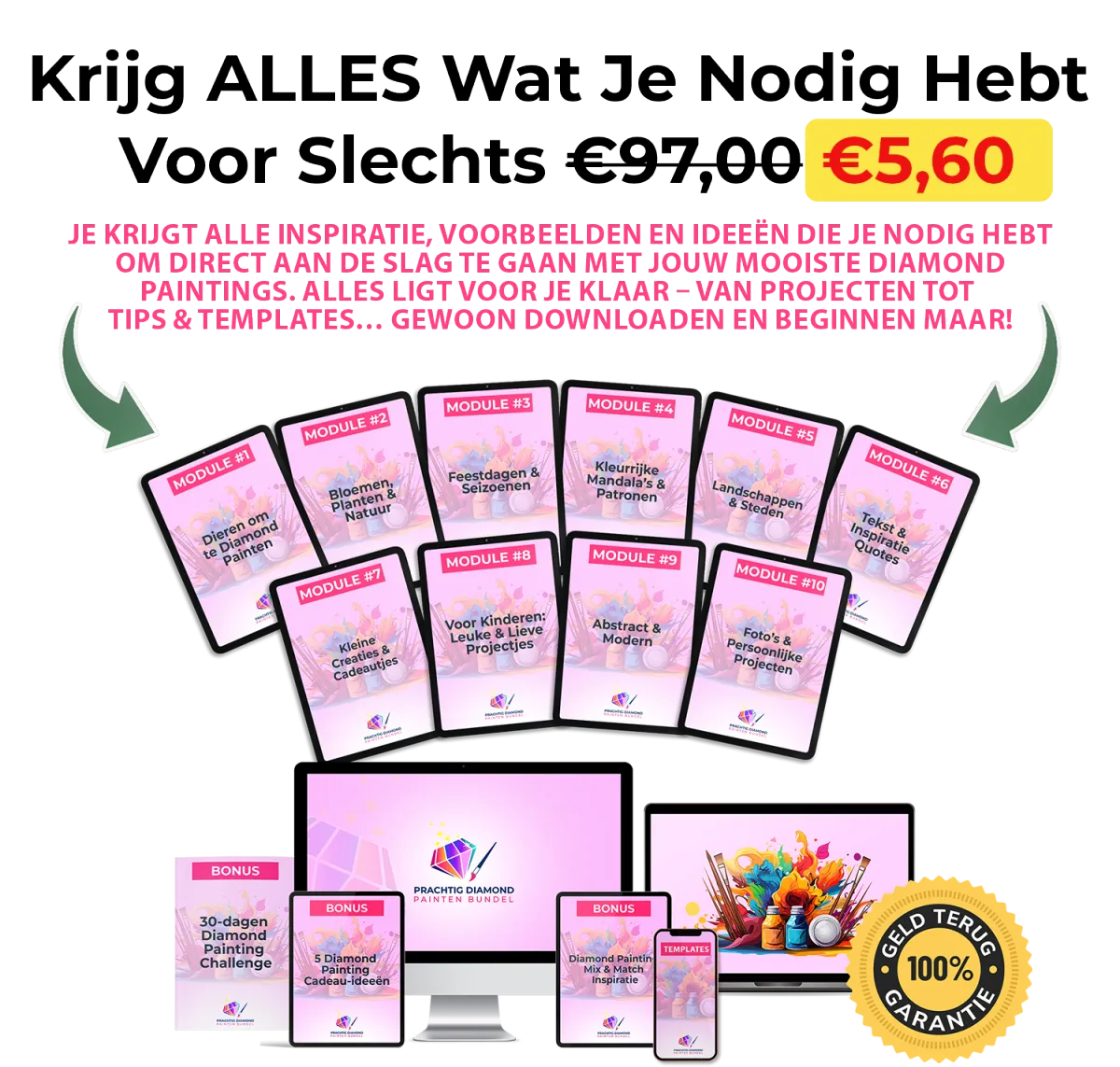 Je kunt vandaag nog starten met de Prachtig Diamond Painten Bundel – jouw complete pakket vol sprankelende projecten waarmee je direct ontspanning én resultaat ervaart. Geen keuzestress, geen zoektocht naar materialen – alleen maar pure fun, kleur en creativiteit.